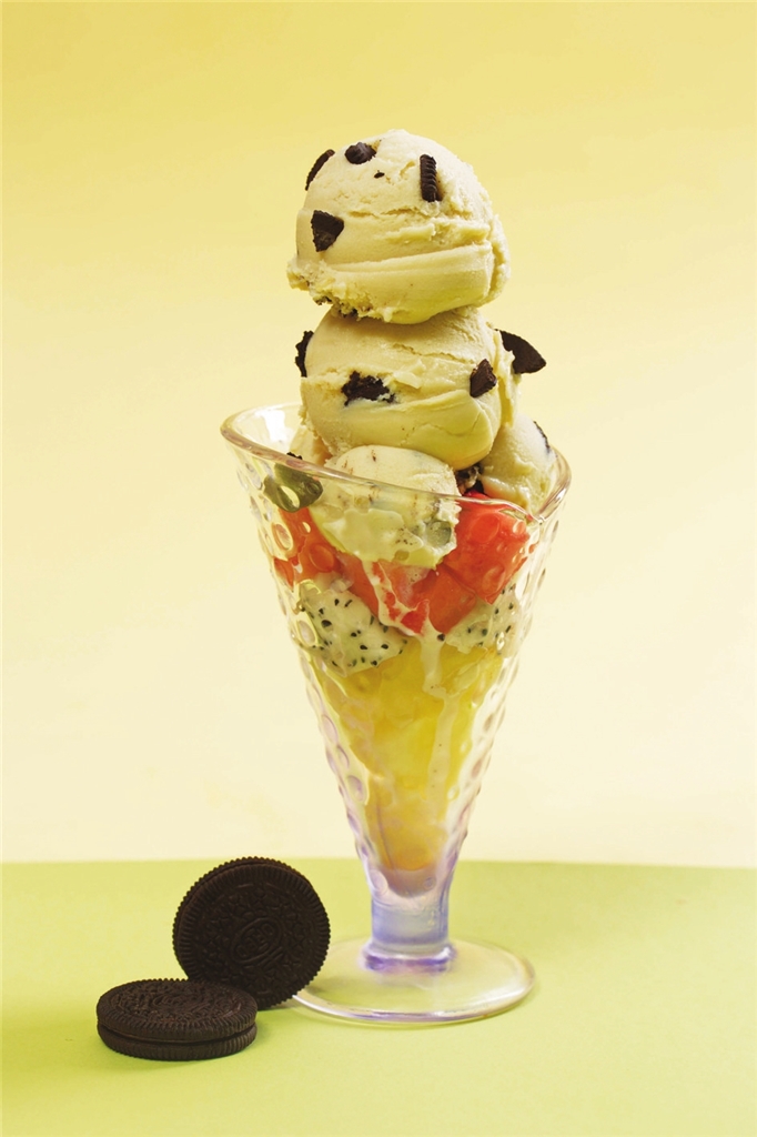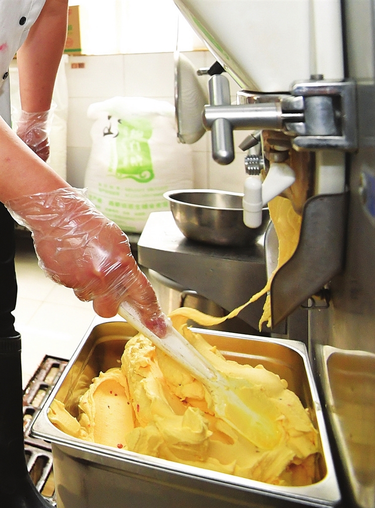 朝开暮落,云卷云舒,36年前成立的雪山冷饮厅始终伫立在食品街南头,见证着时代更迭和社会发展。最早推出的蛋卷冰淇淋及延续至今的沙棘、鲜奶冰淇淋,在那个信息并不发达的年代,仅靠口口相传,这份难得的甜蜜与凉爽,便定格了很多人心中的度夏美好回忆。“年轻时经常带着儿子来吃,现在‘换人’了……”在一层大厅,一对60多岁的老夫妇正陪着五六岁的小外孙解馋,桌上晶莹剔透的玻璃杯中,色彩各异的冰淇淋球令人垂涎。老两口回忆,儿子在外读书,每次回家第一件事就是“来雪山”,点几杯酸甜可口的沙棘冰淇淋过过瘾。“这也是我俩最爱吃的,现在品种、口味多了,但老味道的那几款一直没变。”从一家三口到隔代亲,口味的延续饱含情怀。尽管已经四次升级由意大利引进的冰淇淋机,为了守住老味道,“雪山”严格出品把控,研究配比、甄选食材、揣摩工艺……每个环节都要反复推敲,标准化、高品质迭代。走进生产车间,智能化的冰淇淋机正有条不紊地运转着。车间一隅,新鲜制作的各种口味冰淇淋,透着诱人的甜香。“别看生产工序几乎实现了自动化,最‘吃功夫’的还是其中的人工环节。”太原雪山餐饮有限公司董事长刘晋萍介绍,以生产鲜奶冰淇淋为例,配置时需要将鸡蛋一一洗净,蛋清、蛋黄与纯牛奶、白砂糖均匀搅拌,考验的就是“手上功夫”。沙棘冰淇淋是雪山冷饮的招牌产品。为了从源头把关食材,选材团队多次赴有“塞上绿洲”之称的右玉考察,选取的沙棘颗粒饱满,酸甜适中,常年来与农商形成稳定的专供合作关系。一开始,这款冰淇淋中的沙棘含籽,吃起来影响口感,一粒粒吐籽也多有不便。考虑到沙棘籽含有丰富的微量元素,经过反复的研制尝试,最终将沙棘洗净后连皮带肉带籽进行粉碎,升级版的“无籽”沙棘冰淇淋颇受新老顾客的称赞。所有冰淇淋绝不加任何防腐剂、添加剂,这是“雪山”三十多年来始终坚守的承诺。各类水果口味冰淇淋的食材,全部由新鲜水果压榨而成,天然绿色,货真价实。考虑到冰淇淋产品的特殊性,“雪山”特意自制打包袋,并附送免费冰袋,满足顾客的外送需求。“恪守品质,这是对顾客负责,更是一种社会责任。”刘晋萍话语铿锵。