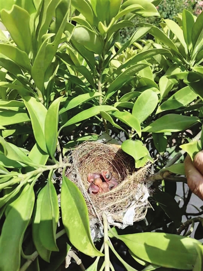 刘先生家住东山朝阳街港道村港道幼儿园附近。最近几天,他发现自家院中一棵1米多高的非洲茉莉上,总是有小鸟飞出,仔细观察,发现这株花中间居然有一个精致的鸟窝,窝里还有两三只嗷嗷待哺的雏鸟。