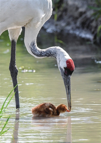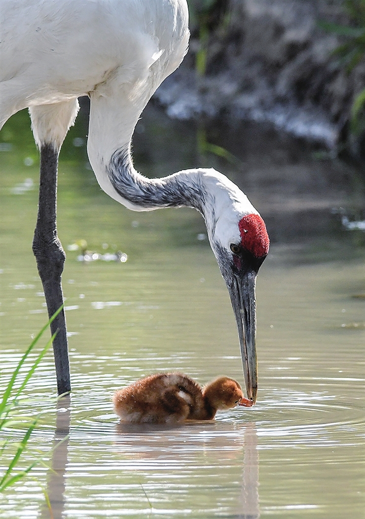 6月21日,成年丹顶鹤给雏鹤喂食。