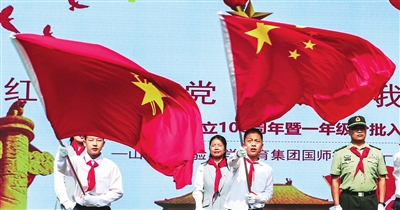 6月23日,山西省实验小学国师街校区举行了“红领巾心向党 队旗伴我共成长”入队仪式,百余名一年级学生佩戴红领巾,在队旗下庄严宣誓,加入中国少年先锋队。