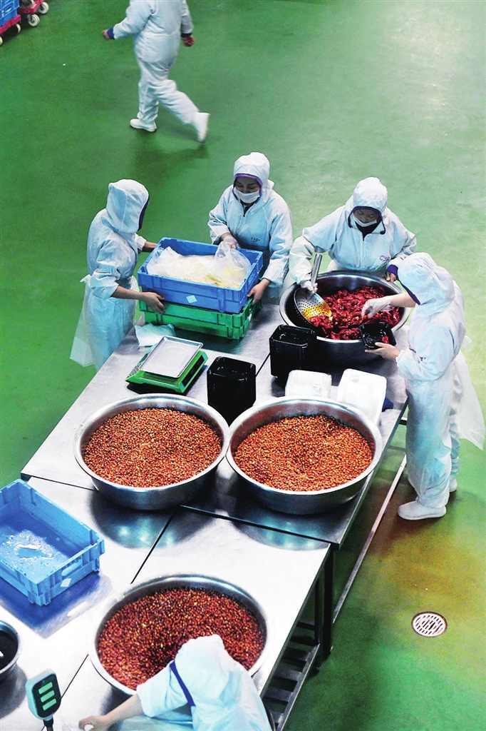 来到生鲜加工中心,身着绿色马甲的工人们正在快速地分装豆角。原来,这些都是为美特好线上销售准备的货品,提前按照统一规格备好,顾客一下单就能迅速配送。来到青菜存储区,这里体感温度明显低一些,在低温的保护下,绿叶蔬菜保持着水润新鲜;而到了冷冻区,极低的温度让人不由冷得发抖,里面作业的工人无一例外地穿着厚厚的棉衣。工作人员介绍,为了保证所有食物最好的品质,物流园对商品分门别类设置了不同的储存温度:加工作业区温度带为6~12℃,保鲜温度带为2~5℃,冷藏库4℃,冷冻库-18℃,肉食、面条急冻库为-35℃。在熟食加工中心,工人们正专心致志地炸制花生米、肉丸子,烤制着香肠……