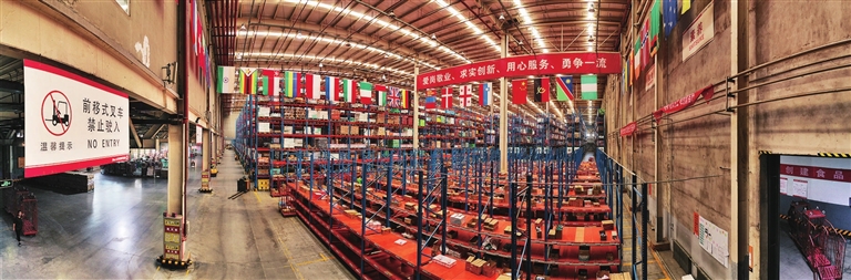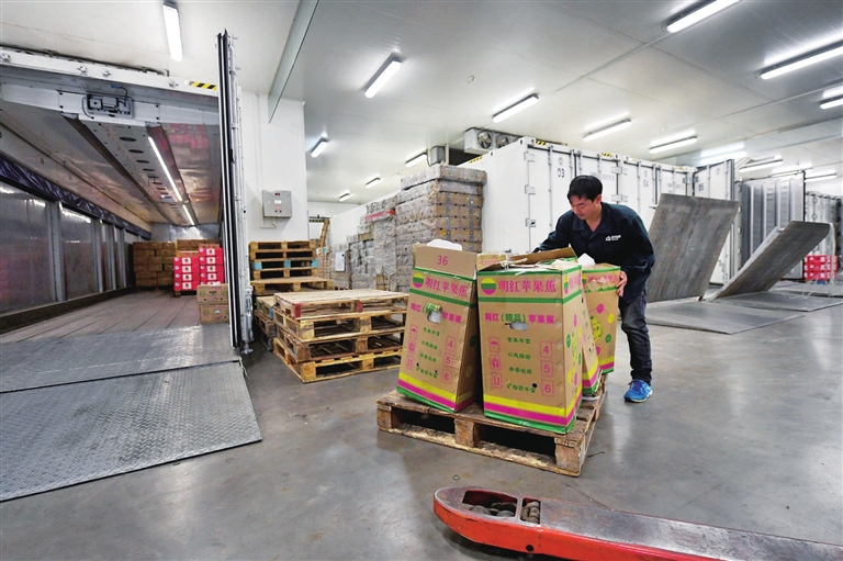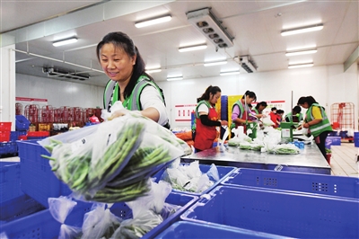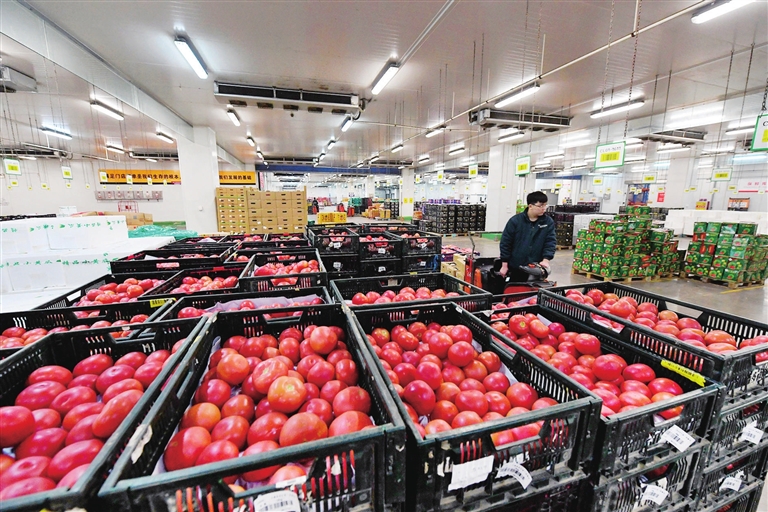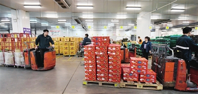 据介绍,农产品冷链加工作业区域面积3万平方米,一层为蔬菜水果加工配送中心和冷冻冷藏品库区及收发货区等,农产品日均出货量达300吨以上,冷链配送率达到100%。二层为生鲜食品加工区,包括畜产粗细加工、蔬菜精加工、水产加工、主食面条加工、冷菜加工、熟食制作、香肠加工等。在满负荷生产时,熟食加工量达4745吨/年。