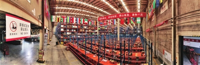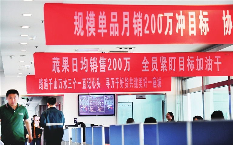 清徐县太茅路高花段228号,美特好农产品配送物流有限公司坐落于此。进入巨大的作业区,“爱岗敬业、求实创新、用心服务、勇争一流”的红色标语赫然入目。园区地面上,一排排摆满物品的蓝色货架高高耸立,货架边不时有各种作业车来往穿梭卸货取货。一旁的电子屏幕上,精确记录着当日各项出库任务。