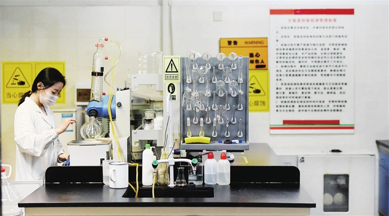 在一个摆满了各种实验器材的房间内,两位工作人员正在认真地对食品进行着化验、分析,这是物流园专门配备的化验室。为了最大限度保障食物的安全健康,专业人员每日都要对食物样品的各项指标进行检测。