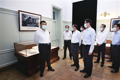 25日下午,习近平带领中央政治局同志来到北大红楼,参观“光辉伟业 红色序章——北大红楼与中国共产党早期北京革命活动主题展”,重温李大钊、陈独秀等开展革命活动、推动马克思主义在中国早期传播、酝酿和筹建中国共产党等革命历史。展厅内,一张张图片、一件件文物,全面展现了那个时期的光辉历史。习近平不时停下脚步,询问相关细节。他指出,北大是新文化运动的中心和五四运动的策源地,最早在我国传播马克思主义思想,也是我们党在北京早期革命活动的历史见证地,在建党过程中具有重要地位。要加强红色资源保护和利用,尊重历史事实,准确评价历史,正确学史用史。