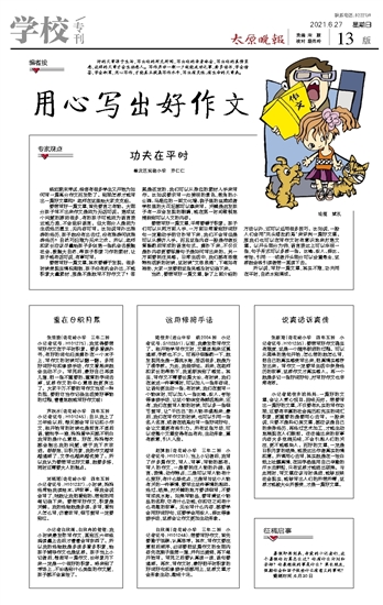 白欣雨(杏花岭小学 三年二班 小记者证号:H101248):想要写好作文,首先要勤于观察、认真思考。其次,写作文要注意前后顺序,必须要把这篇作文的全部内容先在脑子里想一遍,并列出提纲,再下笔开始写。写完之后要认真读一读,语句要通顺。再次,写作文时,最好把平时积累的好词好句和修辞手法都用上,这样文章才会形象生动、趣味十足。