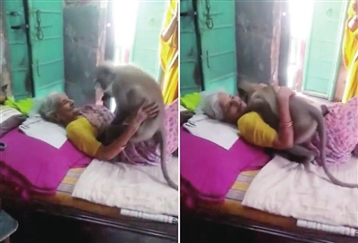 6月29日,印度拉贾斯坦邦一只猴子跑到居民家中,跳到床上抱了抱一名老妇人。