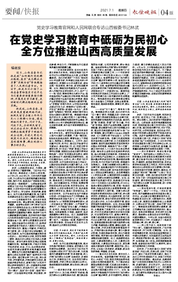 在党史学习教育中砥砺为民初心 全方位推进山西高质量发展