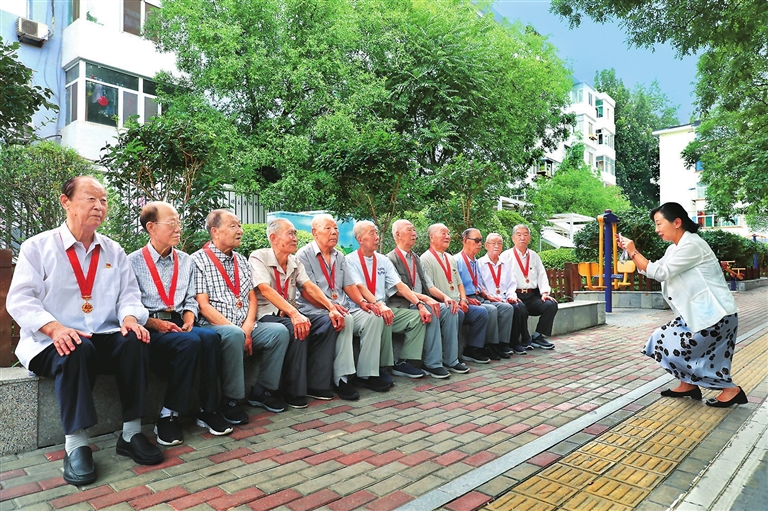 7月1日,桃园二巷南社区11位老党员自发地聚在一起,兴高采烈地佩戴上“光荣在党50年”纪念章合影留念,以此庆贺党的百年华诞。 全媒体记者 宿晓健 摄