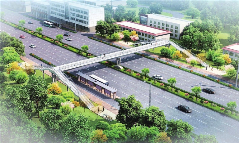 南内环东街双塔公园南门人行天桥,位于双塔公园南门西侧约120米处,西距双塔北路约350米。目前该区域主要通过南内环相交规划路预留的平交路口过街。天桥拟采用两跨变截面连续钢箱梁桥,全长约69.9米,桥跨布置为33.4+33.7米。桥墩设置于道路中央分隔带及现状人行道外侧,在天桥两端设置梯道和梯坡道。