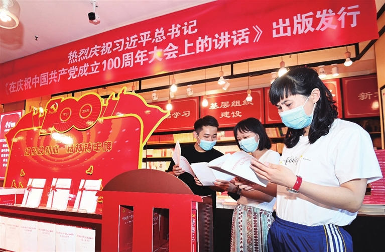 7月5日,山西外文书店,读者正在阅读选购习近平《在庆祝中国共产党成立100周年大会上的讲话》单行本。目前,该单行本已在山西图书大厦、山西外文书店和太原书城三大书店上架发行,接到的预订量达到上万册。 邓寅明 摄