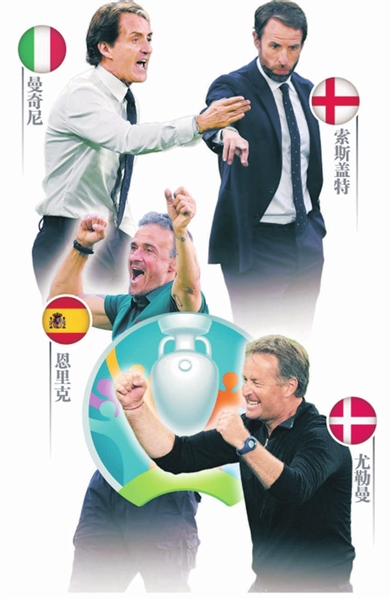 在足球世界里,主教练的黄金执教年龄大多处在50岁至60岁之间。在本届欧锦赛上,最终打入四强的球队主帅恰好都处在这一区间。1964年11月出生的意大利队主帅曼奇尼、1970年5月出生的西班牙队主帅路易斯·恩里克、1970年9月出生的英格兰队主帅索斯盖特、1972年4月出生的丹麦队主帅尤勒曼。他们在本届欧锦赛上都展示出调兵遣将、运筹帷幄的能力,率队一路过关斩将,杀进四强。