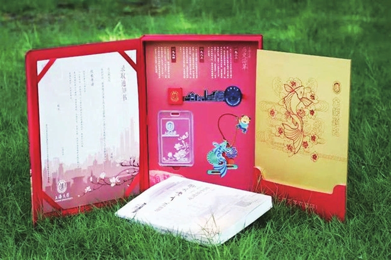 这份通知书更像是一份大礼包,除去通知书本体外,其内还包含:一本上大校史书、一枚锦鲤书签、一个校徽盲盒以及一颗最亮眼的“未来芯”。这颗未来芯启动按钮后将其靠近手机即可读取微信小程序,并领取电子录取通知书。