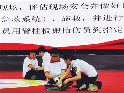 “你好,是120吗?这里是山西工商学院校园内突发火灾,有4人受伤,其中1人呼吸心跳骤停,1人左前臂骨折,1人右小腿烧伤,还有1人有轻微擦伤,需要救助……”在太原中铁轨道公司代表队的火灾场景演练中,参赛队员进入模拟急救现场后,快速观察环境、表明身份、分检伤情,并有序开始进行心肺复苏抢救、止血包扎,在7分钟内完成抢救。