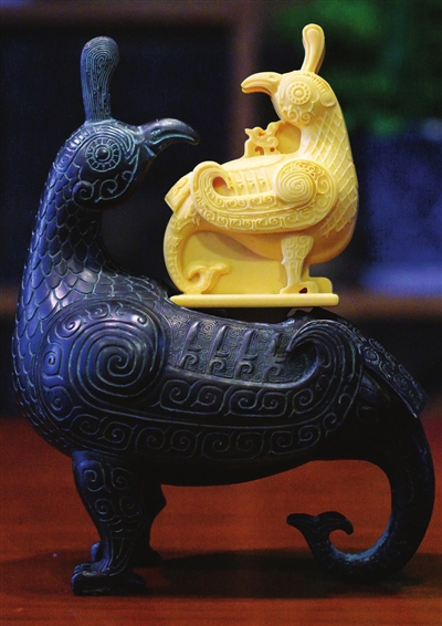 二次设计研发,在卡通“萌萌哒”和原样两种风格之间,研发团队选定了将文物的原本模样展示给观众,精心描绘鸟尊本体,突出文物本身的神韵和花纹,按照比例进行缩小,鸟尊原文物的神韵成功复刻。