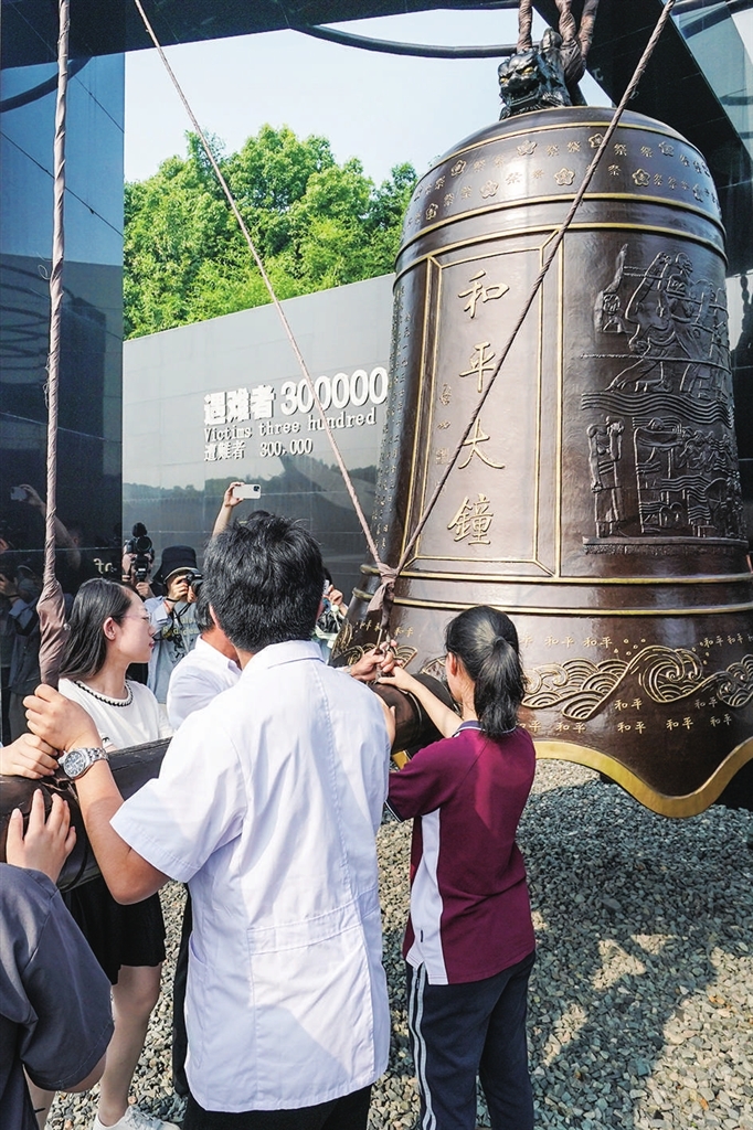 据了解,从2018年9月18日开始,纪念馆常态化开展撞钟悼念仪式,每天邀请首批进馆参观的12名观众代表共同撞响和平大钟13声,寓意对30多万死难者的追思和对和平的祈愿。从此,“江东门的钟声”每天都会响起,截至今日已举办798次,共有9576人参与,撞响10374声。即使受到疫情影响,线下的撞钟仪式暂停,纪念馆线上(官方微博)的撞钟仪式也从未停止。