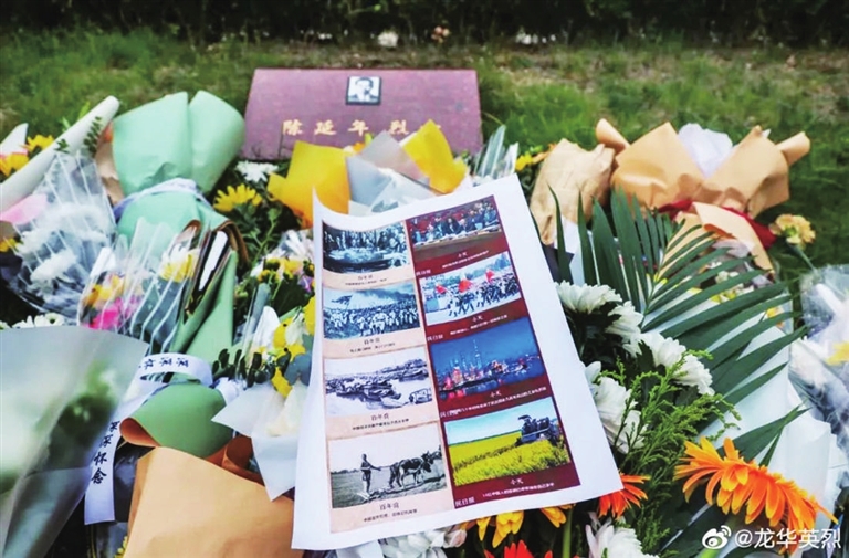 右:在上海龙华烈士陵园,陈延年墓前堆满鲜花。