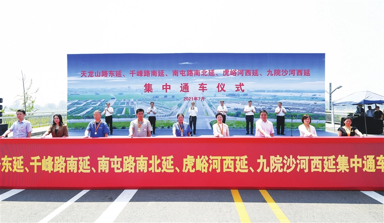 图为天龙山路东延、千峰路南延、南屯路南北延、虎峪河西延、九院沙河西延集中通车仪式现场。 梁琛 摄