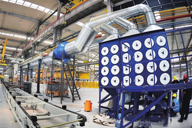 项目以“绿色制造、智能制造、可持续制造”为核心理念,在工艺方法、工艺装备等方面均采用国内领先技术,如塔式起重机整体标准节智能化生产线,配置了32台焊接机器人、6台搬运机器人、8套地面及空中移载机构、14套变位机构、13套物料输送系统,整线自动化程度高。标准节95%以上的焊缝均由机器人完成焊接,焊接质量大幅提升,产品一次下线合格率99%以上,运营成本降低30%以上,人员减少50%以上;塔式起重机片式标准节智能化生产线配置了22台焊接机器人、8台搬运机器人、2套龙门抓手,整线采用一字流布局,全流程自动化生产。其中,高温清洗和处理工艺为行业首创;无VOC(挥发性有机物)排放,厂房内所有焊接作业所产生的烟尘都由一套超大型“抽油烟机”收集、处理,各项环保数据达标后由电脑程序下达排放命令,“杜绝了人为干预,超标排放”,为绿色发展提供了极具前瞻性的解决路径;定制化开发建筑装备生产制造MES系统(制造执行系统)、ERP系统(企业资源计划)、PDM系统(产品数据管理系统)等,打造“1”个平台(工业互联网平台)、“2”个中心(生产监控中心、远程运维中心)、“3”个端(生产端、管理端、服务端)的信息化体系,通过以太网、5G等技术实现设施高度互联,实现建筑装备制造全流程信息化管控。