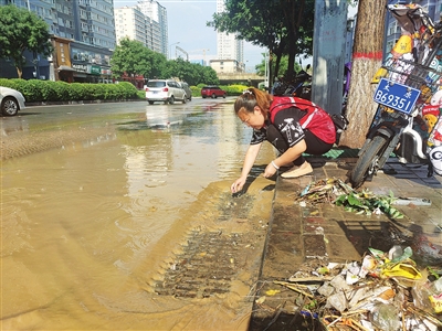 当日下午3时许,巡查的网格员行至建设南路和西太堡街交汇处东南角时,发现该路段积水严重,给车辆、行人通行带来不便。见此情况,迎宾社区主任带领网格员拿着扫把、铲子等工具,对排水口进行清理。由于排水口积攒的多是树枝、绳子、砖块石子和废旧装潢材料等,这些东西纠缠在一起,卡在了排水口,用工具根本无法彻底清除。眼看积水迟迟排不尽,几位网格员没有犹豫,分头行动,徒手清理附近几处排水口的杂物。伴随着这些杂物被清理干净,路面积水快速消退,路人出行变得顺畅。