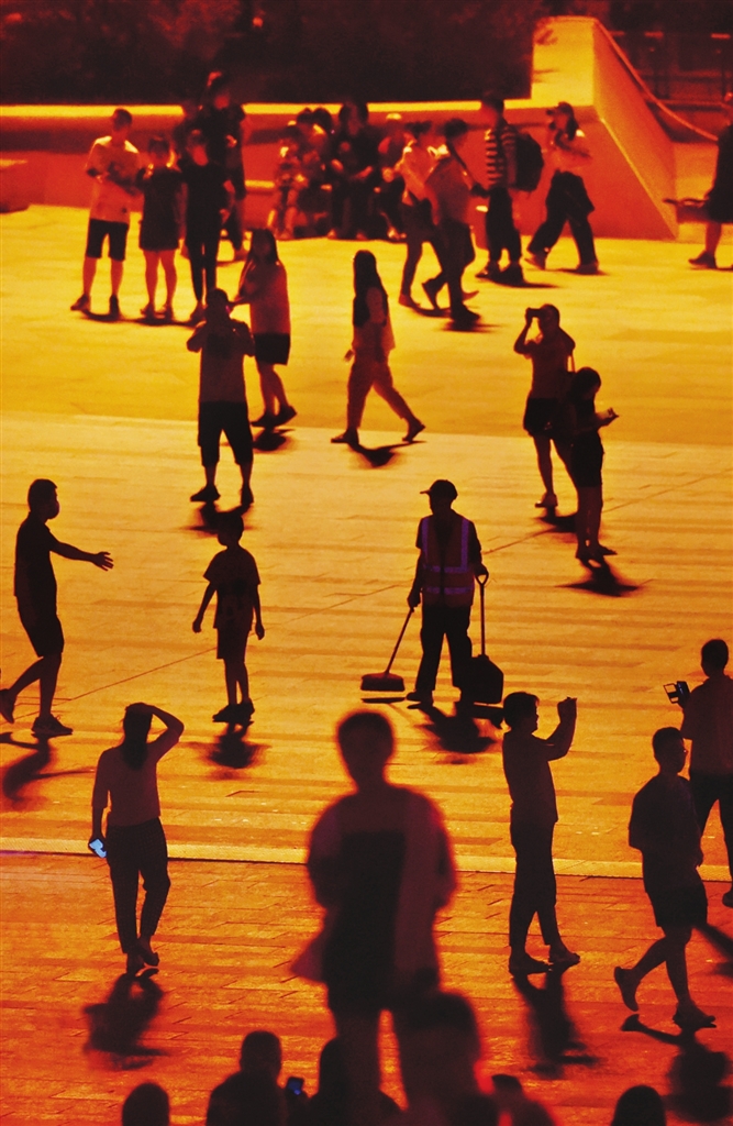 7月13日晚,省城长风商务区,行人剪影勾勒出一幅别样消夏图。观城市灯光秀、骑行健身、看露天电影、逛夜市……城市休闲场所的完善和文化生活的丰富,让市民的休闲、消夏有了更多的选择。