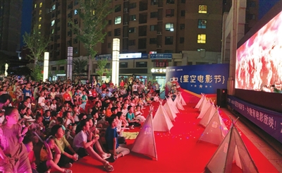 电影开场,广场上顿时安静下来。老年人、年轻人、小孩子其乐融融聚在一起,共同观看了电影《建党伟业》《哥斯拉大战金刚》。大家以星空为影厅,把情怀做影票,与家人朋友静静品味。