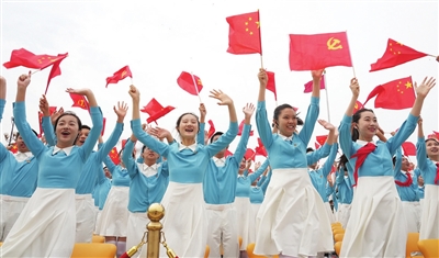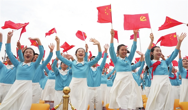 歌声、掌声、欢呼声……天安门广场上,数万人挥动着手中鲜艳的党旗、国旗,汇聚成了红色海洋。