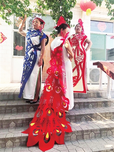 介绍完自己的作品,任美萍也穿上剪纸旗袍,与同伴一同进行展示。她表示,会将这份爱好坚持下去,带领姐妹们剪出更多美好的作品,“装点”大家的生活。