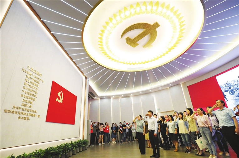 在中共一大纪念馆,高3米、宽7米的巨幅油画《星火》吸引不少参观者驻足。画面上,各地共产党早期组织的50余名成员昂首挺胸,意气风发向前行进。理想信念之火一经点燃,就永远不会熄灭……