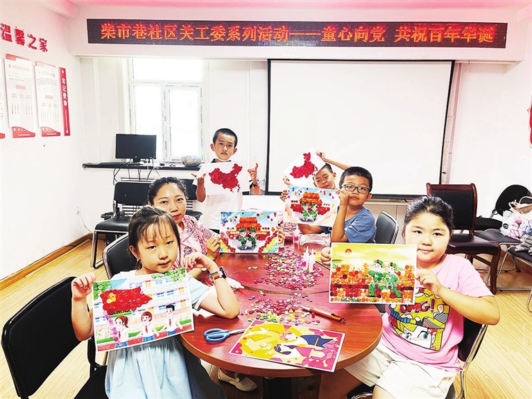 活动中,相关教师志愿者向参加活动的小朋友演示了纽扣画的制作步骤。随后,社区志愿者以“童心向党”为主题,耐心引导和帮助孩子们制作纽扣画。孩子们十分投入,充分利用胶水将各种颜色的扣子一枚枚固定在卡纸上,将自己天马行空的创意展现出来。一颗颗纽扣串起了一声声祝福,一幅幅画展现了一颗颗爱党爱国心。