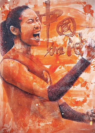 赵龙告诉记者:“这幅画其实我画了两遍,第一遍是黑白素描的,我觉得不太好,后来改成了彩色的,底色用中国红,象征中国激情澎湃的体育精神,也祝愿所有上场的中国奥运健儿鸿运连连。中国女排加油!中国加油!”