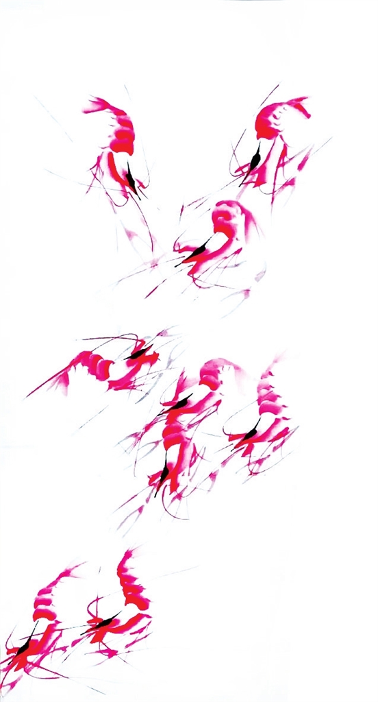 戈氏之虾,灵动飘逸,静躁起伏,千姿百态,不拘一格,而最能反映画者心态的是许多上了纸墨的虾儿,每一只都精神抖擞,骄若惊龙,即使是一群,也像一支开赴前线的尖刀分队,赳赳昂昂。对此,我曾现场点评说,意象反映画者的内在,一个心气焦枯的人是作不出这样的画的。戈兄听了,哈哈大笑。除了精神焕发的虾,也有静如处子的虾,成群结队的虾,散如星辰的虾,大小不一的虾,若有所思的虾,水墨的,线条的,混搭的,用尽态极妍来形容它们,一点也不过分。戈先生画虾,常常一画就是一整天,画好的虾挂在墙上,铺在地上,使之成为一个立体的世界。在大部分的作品上,一般都有题跋,或者用一个成语,或者是一句诗词,也有的是密密麻麻的一段话,不知所来,未明所去。