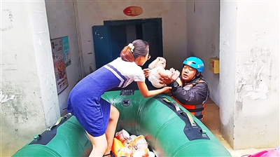 上午11时许,一个中年男子跑来,着急地对救援人员说,他的女儿马上要生产,希望救援人员帮忙送往医院。没有耽搁,赶紧乘坐橡皮艇前往救援。孕妇所在小区水深1.6米左右,施救难度颇大。见到孕妇,她临盆在即,表情痛苦。担架已用完,又不能背孕妇涉水,救援人员十分着急。一番寻找,终于发现一扇门板,小心翼翼地将孕妇抬下楼,送往医院。