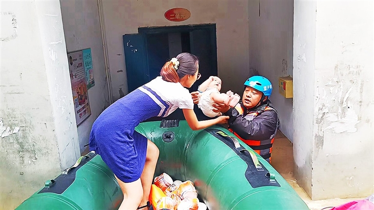 接着,救援队员又遇到两位老人,两人着急回家,但所住小区被湍急的水流阻挡,无法通过。当时,救援队员在水中已奋战数小时,十分疲惫,但为了帮助两位老人,他们没有任何犹豫,划着橡皮艇,艰难地在水中前行,将两位老人安全送回家。