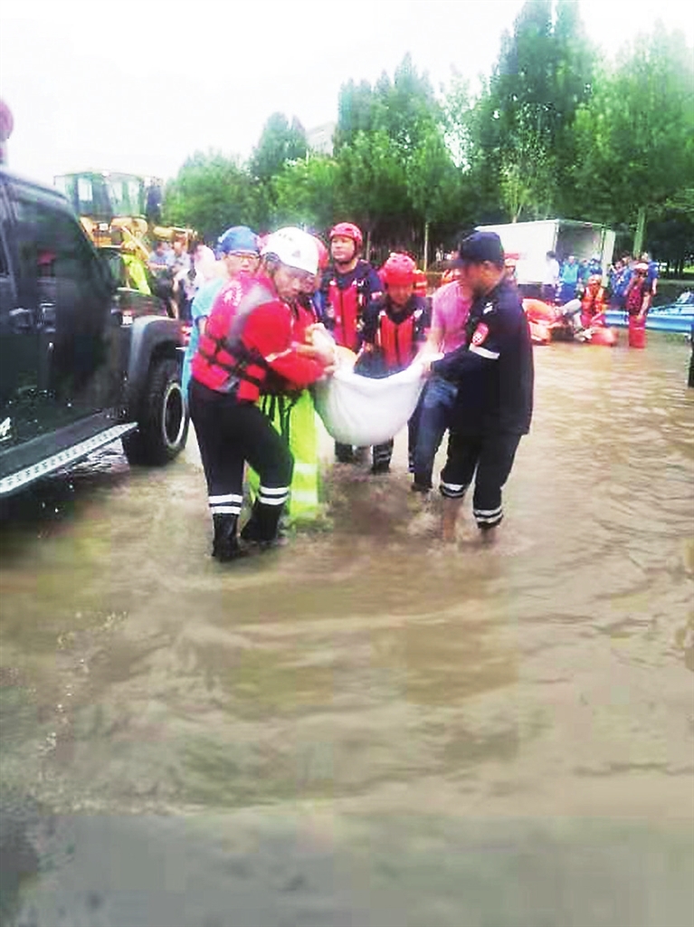 情况紧急,救援队员立即通过地图搜索相应位置,全速赶往被困女子所在小区。到达小区外围,积水很深。由于用来救援的橡皮艇已经全都派出,救援队员马上决定蹚水进入小区内。救援人员找到被困女子时,发现她生命体征尚平稳,但需要立即送往医院。随即,救援队员背起该女子,蹚水而出,将其送往医院。