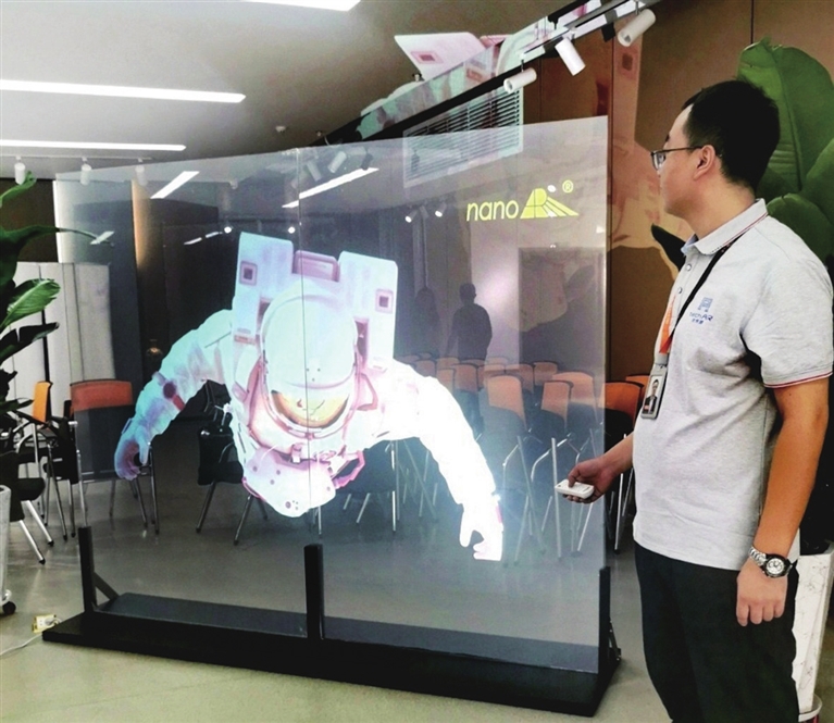 走进智创城NO.8的六层展厅,顿时被一种强烈的科技感包围。抬眼,可见一块巨大的玻璃立于展厅的中间位置。记者左看右看,感觉这个展品与普通玻璃别无二致,只是厚度更薄,只有几毫米,且更加透明光洁。但随着一台投影仪开始工作,这块玻璃即刻变身为显示屏,播放的画面特别逼真,有浮空立体的效果,沉浸式的观感让人直呼神奇。据展厅工作人员介绍,奥妙就藏于这块玻璃中。
