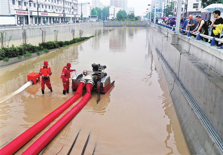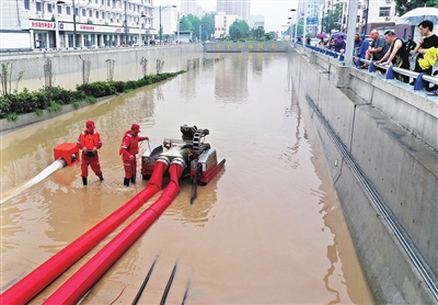 7月22日,来自江西的救援人员在郑州市京广南路隧道进行排涝作业。
