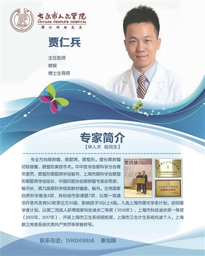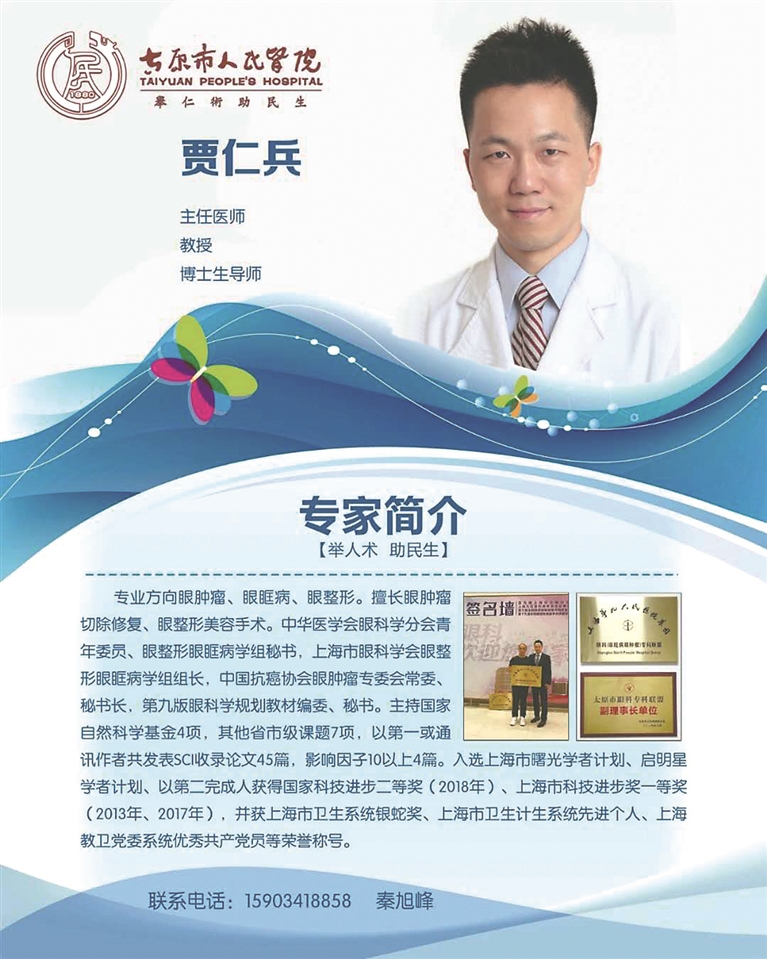 贾仁兵,上海交通大学医学院附属第九人民医院主任医师、教授、博士生导师。中华医学会眼科学分会青年委员、眼整形眼眶病学组秘书,上海市眼科学会眼整形眼眶病学组组长,中国抗癌协会眼肿瘤专委会常委、秘书长,第九版眼科学规划教材编委、秘书。主持国家自然科学基金4项,其他省市级课题7项,以第一或通讯作者共发表SCI收录论文45篇,影响因子10以上4篇。