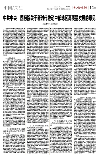 中共中央 国务院关于新时代推动中部地区高质量发展的意见