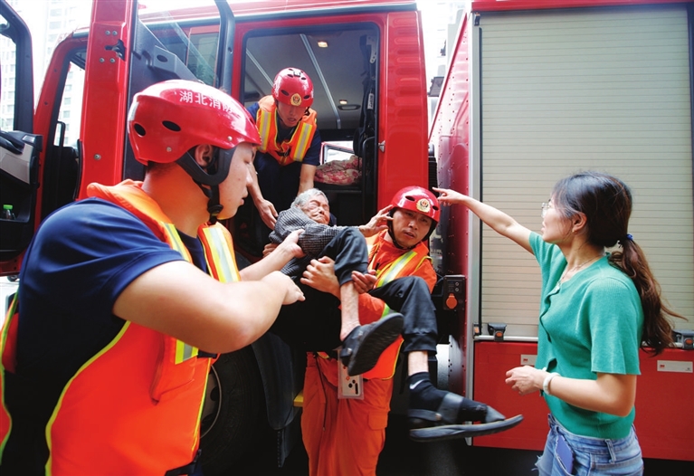 当日,正在河南省郑州市中牟县白沙镇商都路参与防汛救灾的湖北武汉消防指战员接到求救电话,一名99岁高龄的奶奶家停水停电,其家人接到她后因为路面积水无法转移,消防人员迅速利用救援担架与消防车将老奶奶转移到亲属家中。 新华社 发