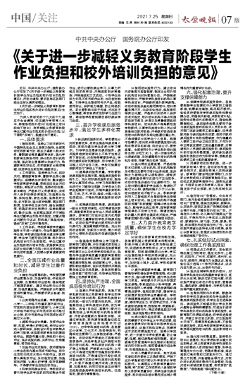 《关于进一步减轻义务教育阶段学生 作业负担和校外培训负担的意见》