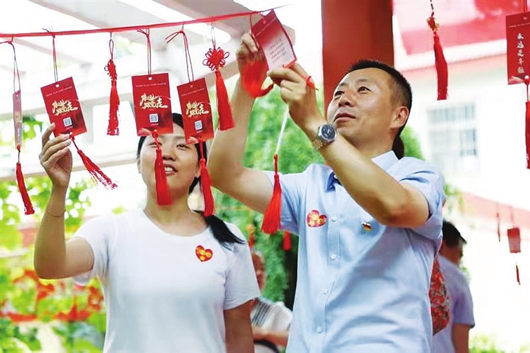 当天,劲松社区庭院党校“百年亭”设置了“永远跟党走”主题音乐角。现场人员每人选取一张赞歌卡,挂于长廊红丝带上。中央党校在职研究生史俊维通过5种不同风格的音乐形式,向大家讲述了中国共产党为求得中华民族的伟大复兴,在革命浪潮中勇敢探索、勇担使命的历史担当。播放《江姐》电影片段时,江姐深深亲吻绣好的国旗画面一幕,令大家忍不住流下了热泪。跟随着《红梅赞》的旋律,现场党员有节奏地挥动着手中的国旗和着节拍哼唱,抒发对党的热情。