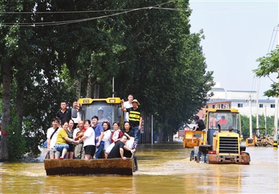 新乡市凤泉区大块镇是泄洪区,全镇14个行政村有12个村被淹,其中秀才庄、孟庄、石庄等三个村共1万多人受灾严重,不断有救援人员载着受困村民转移。