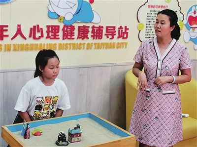 当天下午,在后小河小学心理健康辅导站,参加托管的孩子在老师的指导下,轮流选取喜欢的玩具摆放在自己的沙盘中,然后讲述一个有关于玩具的故事。