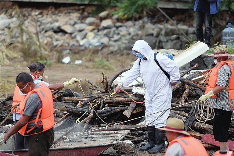 7月28日,工作人员对打捞上岸的杂物进行消杀。
