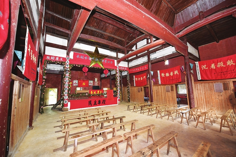 然而,乡野间一座仅500余平方米的小小祠堂,便“装”下了整个红色政权的首脑机关。走进瑞金叶坪镇谢家祠堂,可以看到10余个用木板隔出的小间,其面积虽小,却有着响亮的名字:外交人民委员部、司法人民委员部……