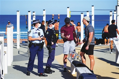 7月27日,警察在澳大利亚悉尼海边的户外健身区检查人们的身份信息。澳大利亚新南威尔士州政府28日宣布,鉴于新州新冠疫情形势仍不见好转,首府悉尼将再次延长“封城”一个月。 新华社 发