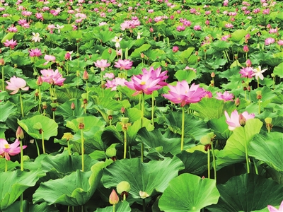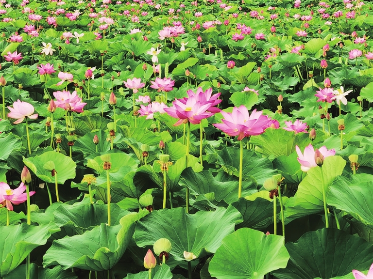 南园3000平方米、20多个品种、约4000余株的荷花竞相摇曳。放眼望去,片片浓绿和点点粉红,与蓝天白云相映成趣,美景让人心醉。