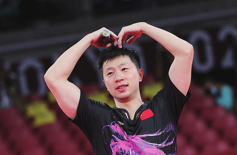 获胜后,马龙举起双手比出一个大大的心,与五年前里约夺冠后胸前的比心遥相呼应。