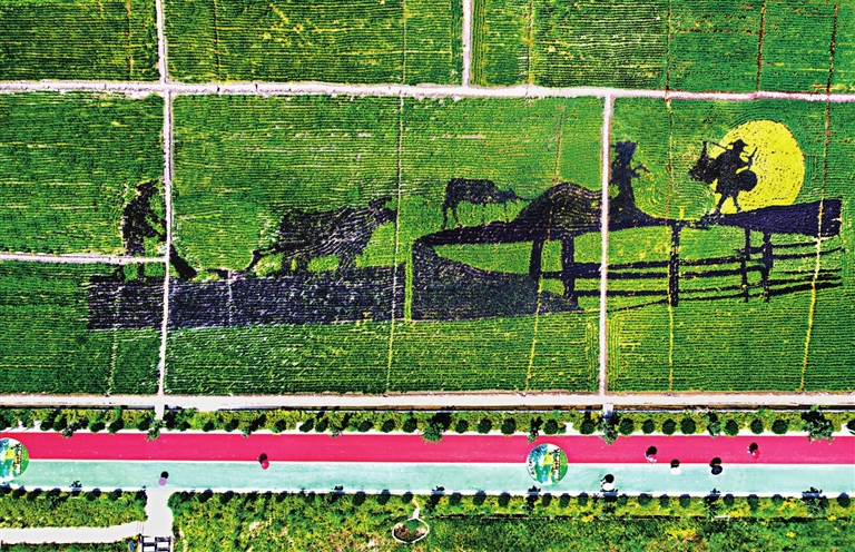 红绿相间的步道,阡陌纵横的稻田,赭褐色的农耕图成为晋源区稻田公园夏日的别样风景。 记者 宿晓健 摄